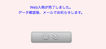 | 右記のように表示されるとアップロード完了です。 ※時間帯やファイル容量よっては入稿に時間がかかる場合があります。 ※画面が切り替わる前にブラウザを閉じると送信が完了しません。 容量が大きい場合や入稿がスムーズに行えない場合は、 ▼ファイル転送サービスをご利用の場合 をご確認ください。 |